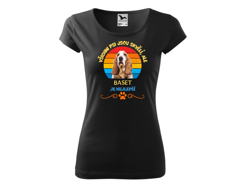 Originální dámské tričko s motivem plemene Baset. Tričko s potiskem je vhodné jako dárek k narozeninám nebo k Vánocům.