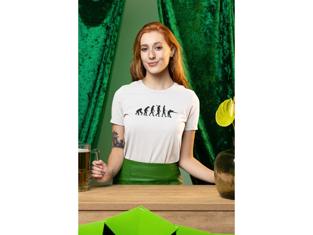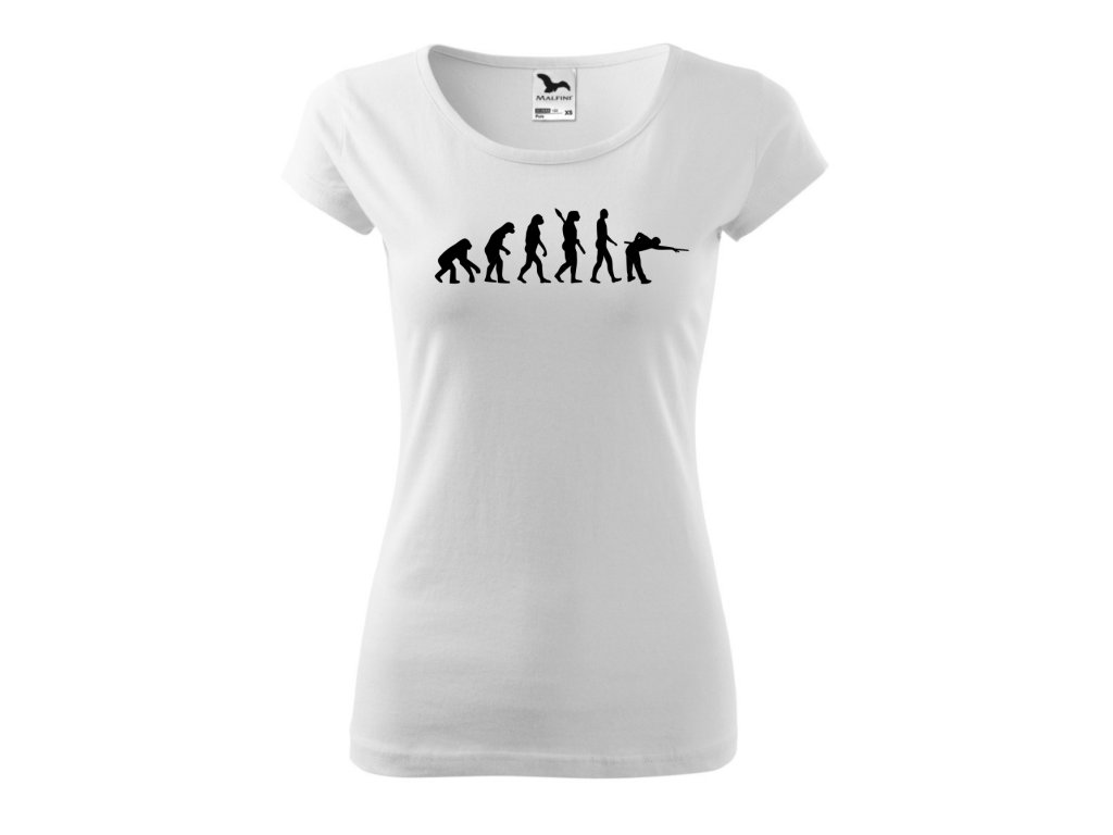 Dámské tričko pro hráčky kulečníku Evoluce billiard v bílé barvě. Darujte tričko svojí hráčce kulečníku. Triko s potiskem je originální a vtipný dárek.