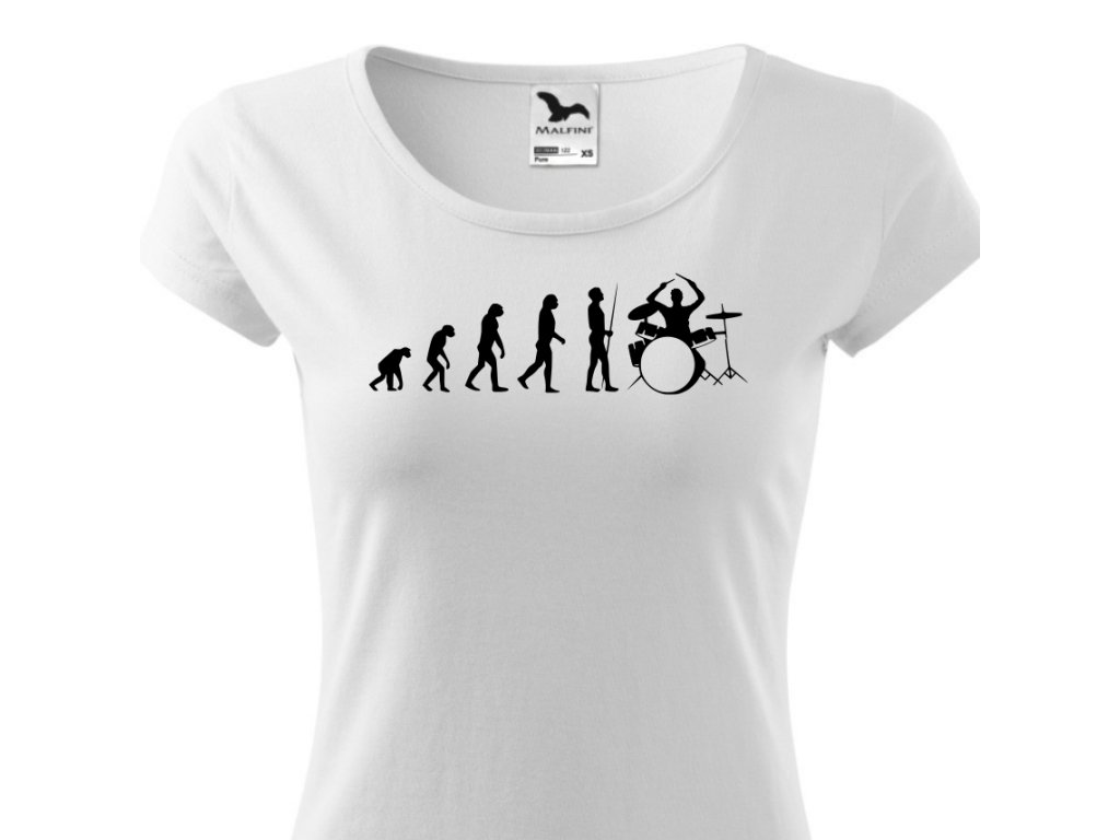 Dámské hudební tričko Evoluce bubeník v bílé barvě. Darujte tričko svým blízkým nebo sobě. Triko s potiskem je originální a vtipný dárek.