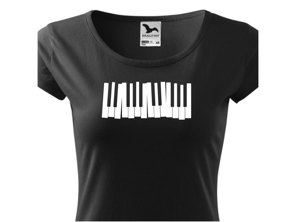 Dámské hudební tričko Klávesy v černé barvě. Darujte tričko svým blízkým nebo sobě. Triko s potiskem je originální a vtipný dárek.