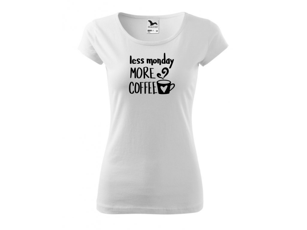 Dámské tričko pro milovnice kávy Less monday more coffee v bílé barvě. Darujte tričko své milovnici kávy. Triko s potiskem je originální a vtipný dárek.