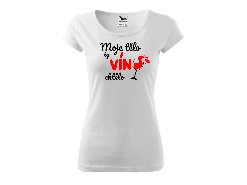 Dámské tričko Moje tělo by víno chtělo v bílé barvě. Potěšte sebe nebo svoji kamarádku k narozeninám nebo jen tak. Triko s potiskem je originální a vtipný dárek k narozeninám.