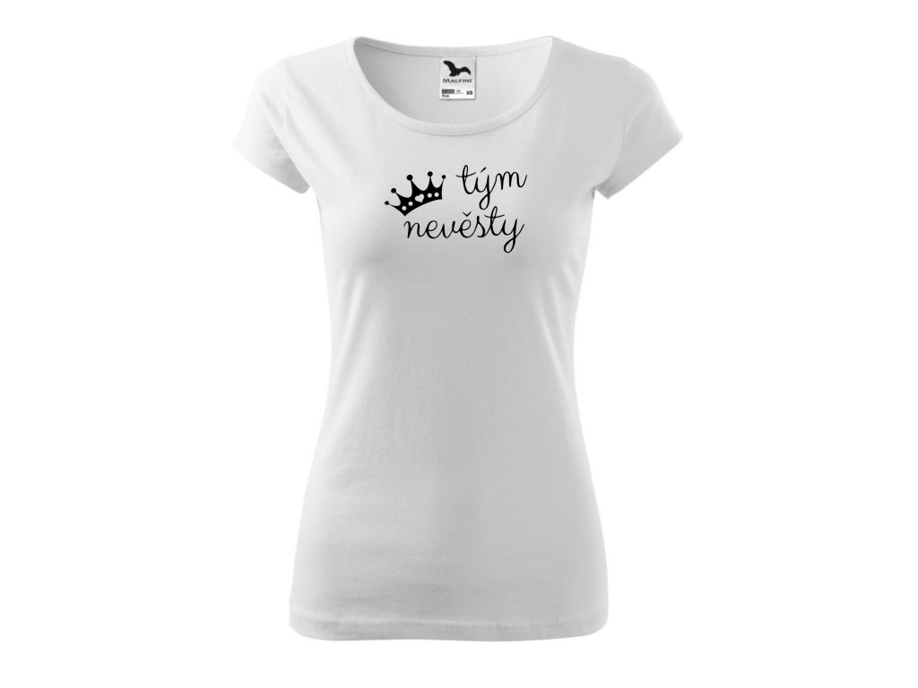Dámské tričko na rozlučku se svobodou Tým nevěsty(korunka) v bílé barvě. Triko s potiskem je originální a vtipný dárek.