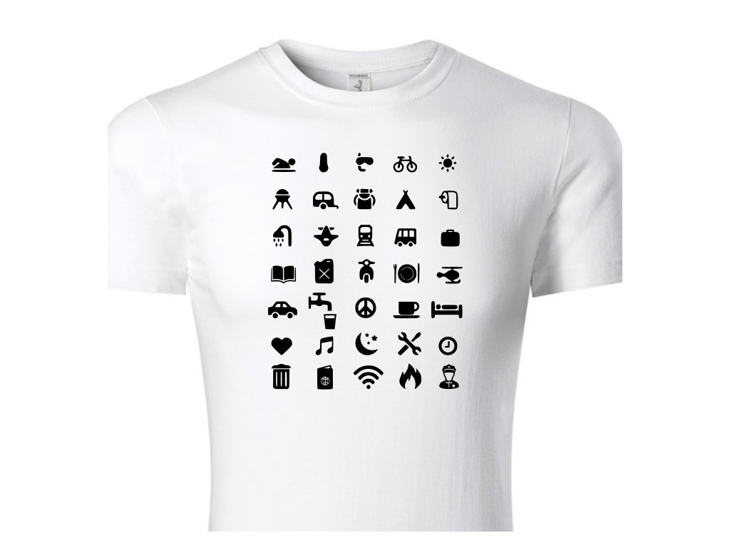 Dětské tričko pro cestovatele Cestovní ikony v bílé barvě. Darujte tričko svému cestovateli. Triko s potiskem je originální a vtipný dárek.