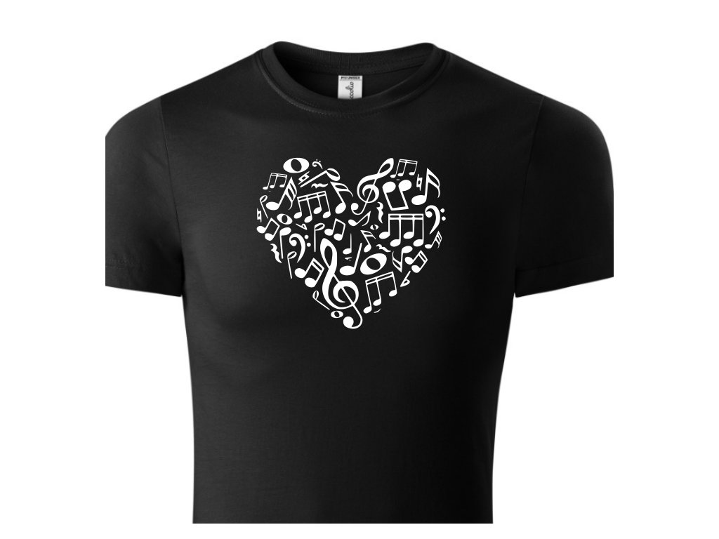 Dětské hudební tričko Hudba srdce v černé barvě. Darujte tričko svým blízkým. Triko s potiskem je originální a vtipný dárek.