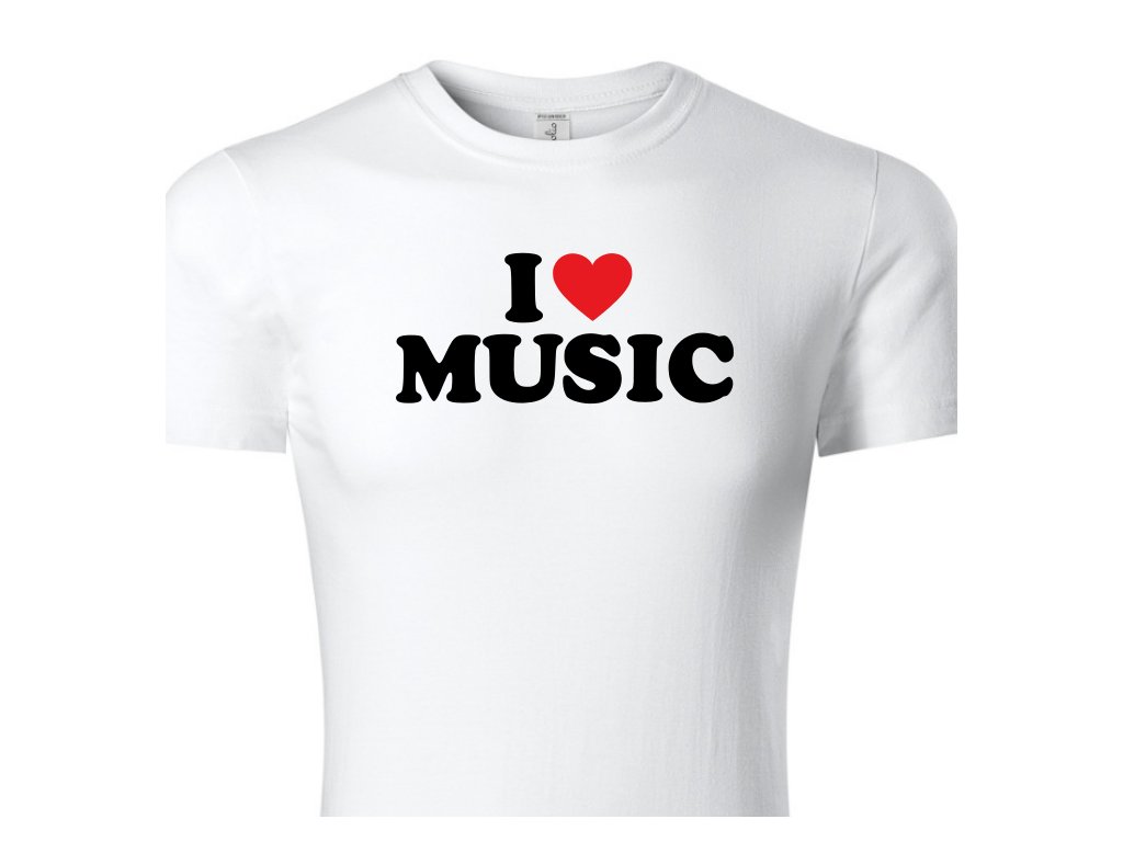 Dětské hudební tričko I love music v bílé barvě. Darujte tričko svým blízkým. Triko s potiskem je originální a vtipný dárek.