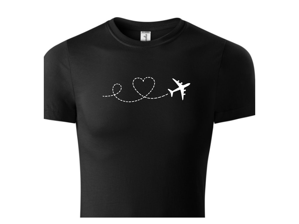 Dětské tričko pro cestovatele Letadlo srdce v černé barvě. Darujte tričko svému cestovateli. Triko s potiskem je originální a vtipný dárek.