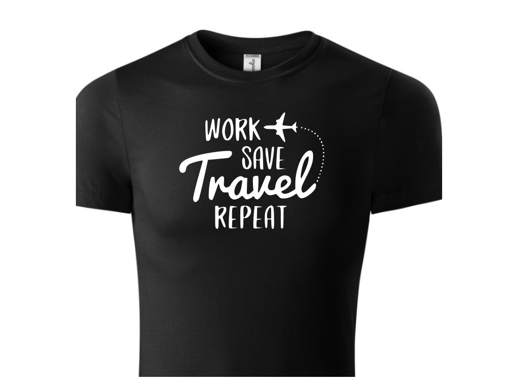 Dětské tričko pro cestovatele Work save travel v černé barvě. Darujte tričko svému cestovateli. Triko s potiskem je originální a vtipný dárek.