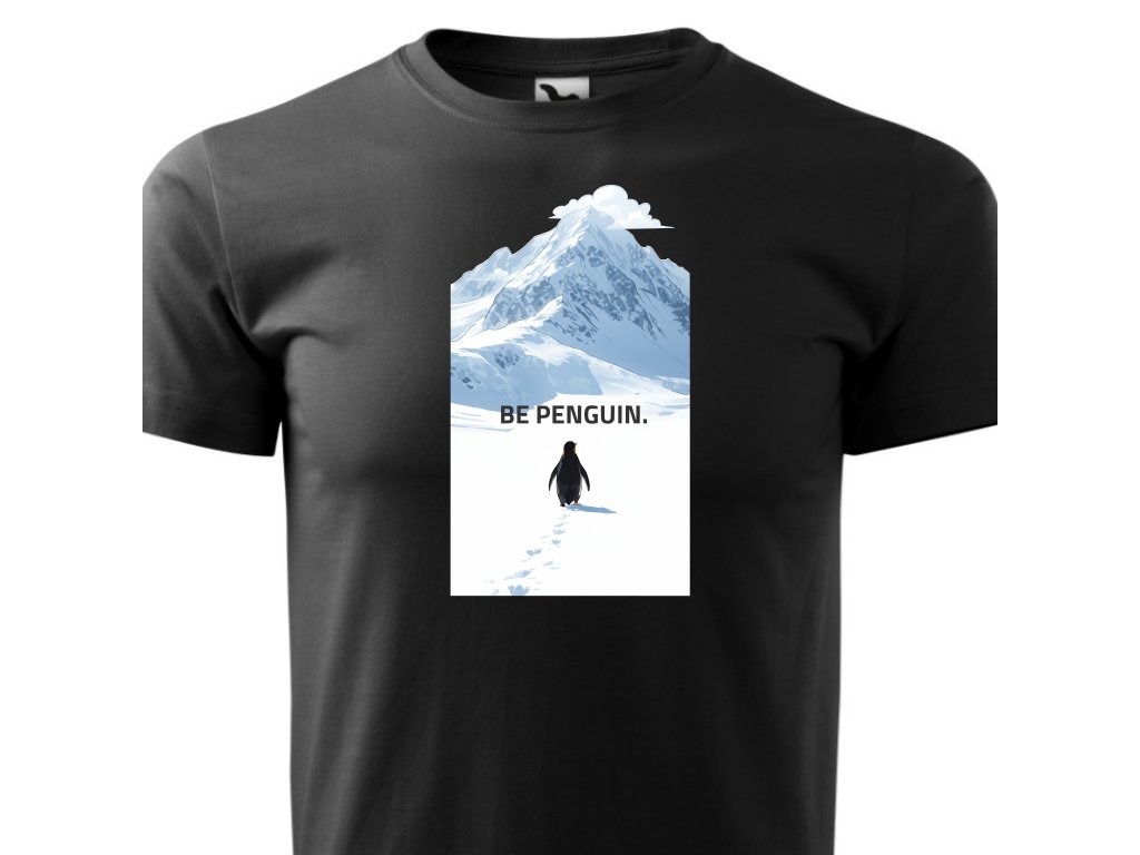 Pánské tričko Be penguin v černé barvě. Tento design je poctou nejslavnějšímu „zmatenému“ tučňákovi z dokumentu Wernera Herzoga. Je to symbol pro všechny, kteří se občas cítí v dnešním světě trochu nepatřičně, pro ty, co mají vlastní hlavu, nebo pro ty, kteří prostě milují absurdní humor a legendární memes.