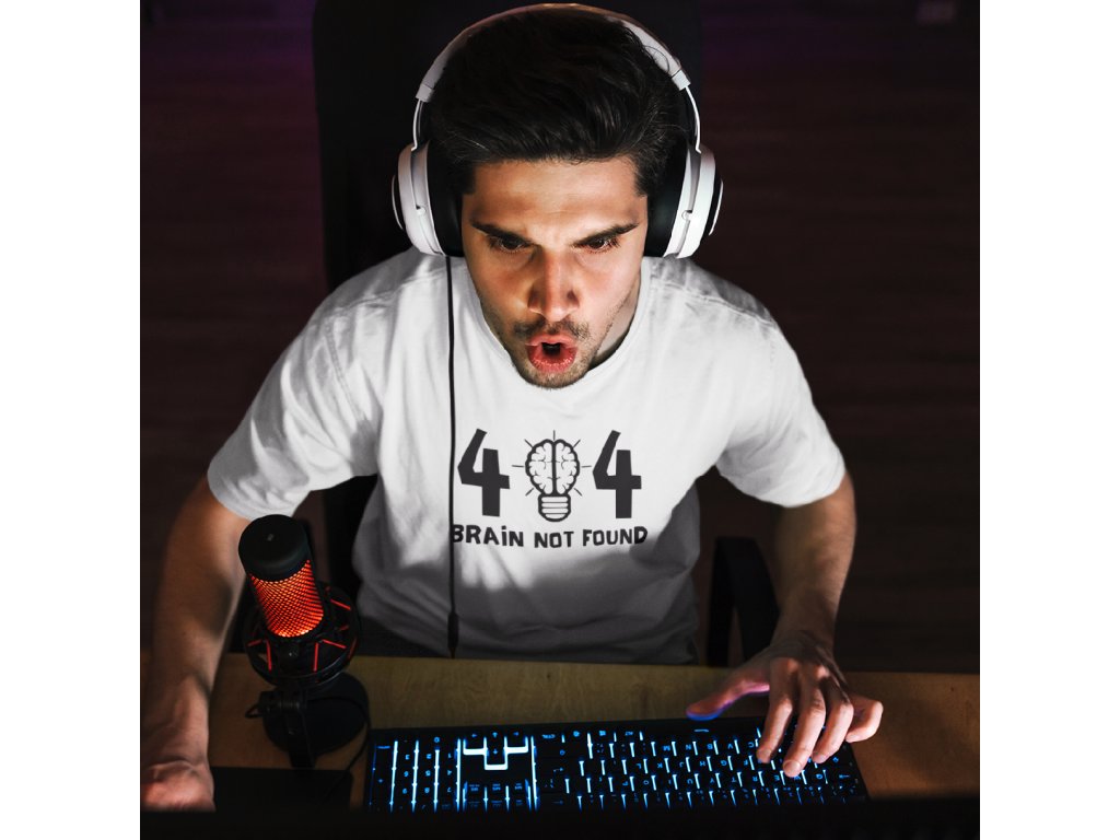 Pánské tričko pro milovníky her(e-sport) Brain not found v bílé barvě. Darujte tričko svému hráči. Triko s potiskem je originální a vtipný dárek.