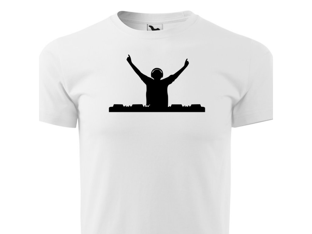 Pánské hudební tričko DJ v bílé barvě. Darujte tričko svým blízkým nebo sobě. Triko s potiskem je originální a vtipný dárek.