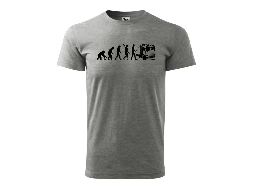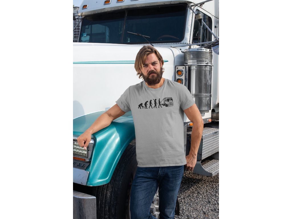 Pánské kamioňácké tričko Evoluce(Kamioňák) v šedé barvě. Darujte tričko svému kamioňákovi. Triko s potiskem je originální a vtipný dárek.