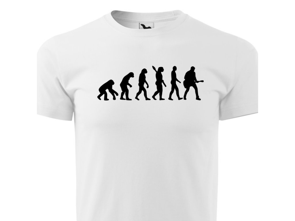 Pánské hudební tričko Evoluce kytarista v bílé barvě. Darujte tričko svým blízkým nebo sobě. Triko s potiskem je originální a vtipný dárek.