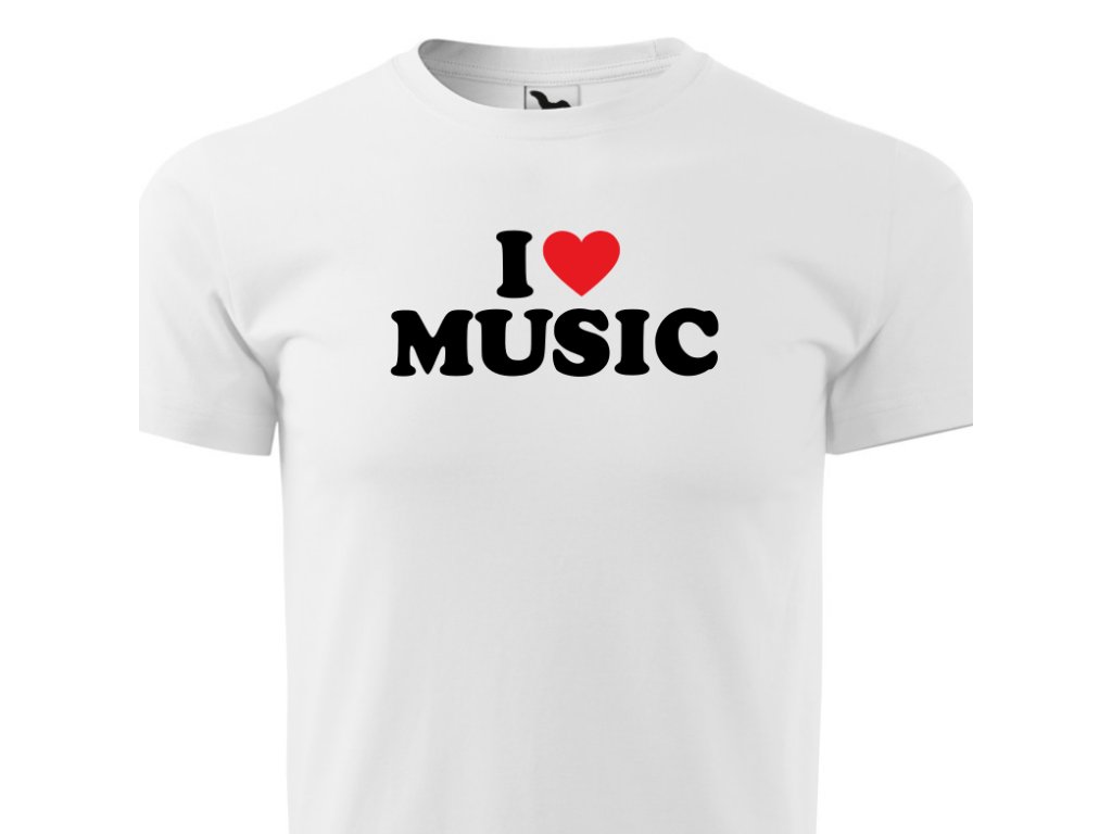 Pánské hudební tričko I love music v bílé barvě. Darujte tričko svým blízkým nebo sobě. Triko s potiskem je originální a vtipný dárek.