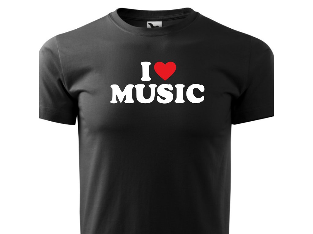 Pánské hudební tričko I love music v černé barvě. Darujte tričko svým blízkým nebo sobě. Triko s potiskem je originální a vtipný dárek.