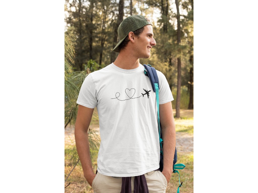 Pánské tričko pro vášnivé cestovatele Letadlo srdce v bílé barvě. Darujte tričko svému cestovateli. Triko s potiskem je originální a vtipný dárek.