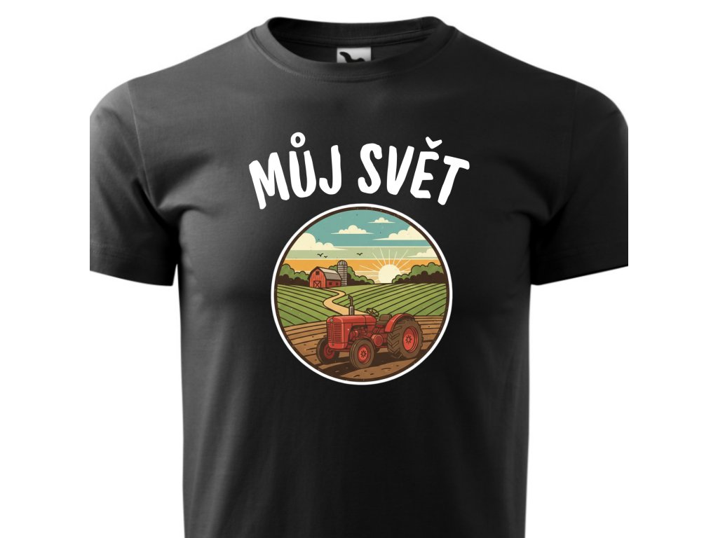 Pánské zemědělské tričko Můj svět v černé barvě. Darujte tričko svému zemědělcovi. Triko s potiskem je originální a vtipný dárek.