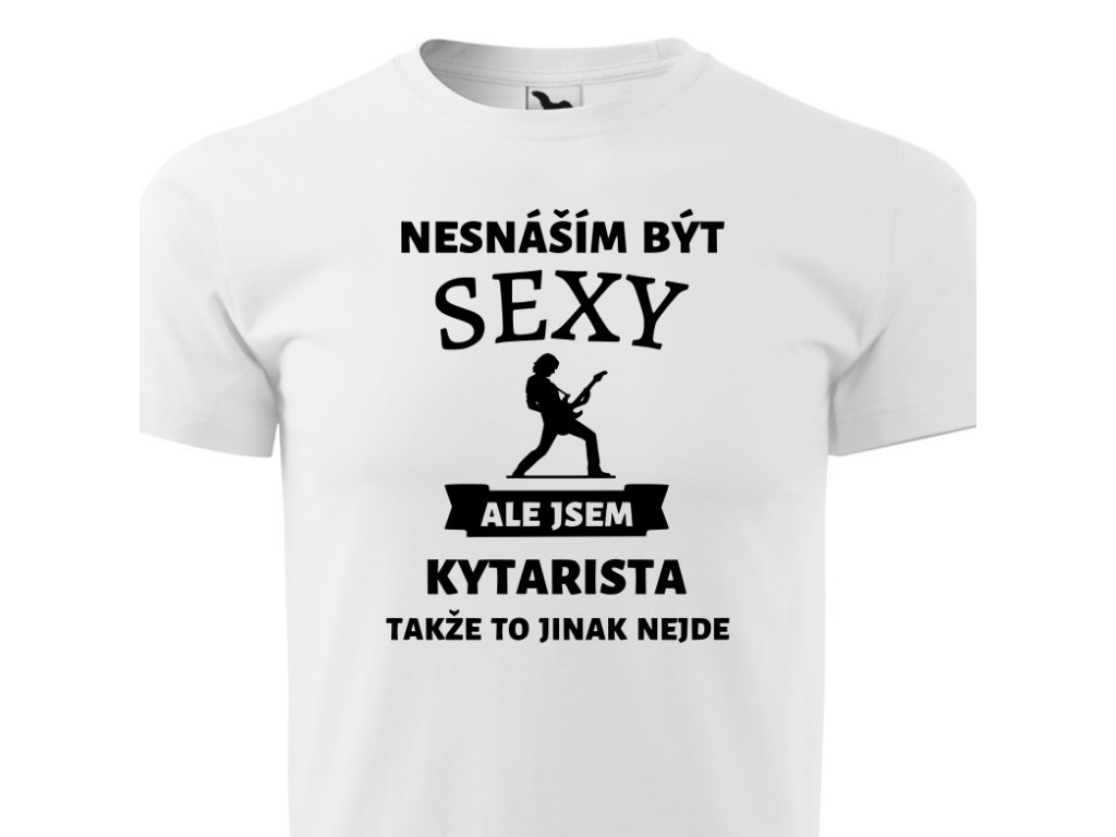 Pánské hudební tričko Sexy kytarista v bílé barvě. Darujte tričko svým blízkým nebo sobě. Triko s potiskem je originální a vtipný dárek.