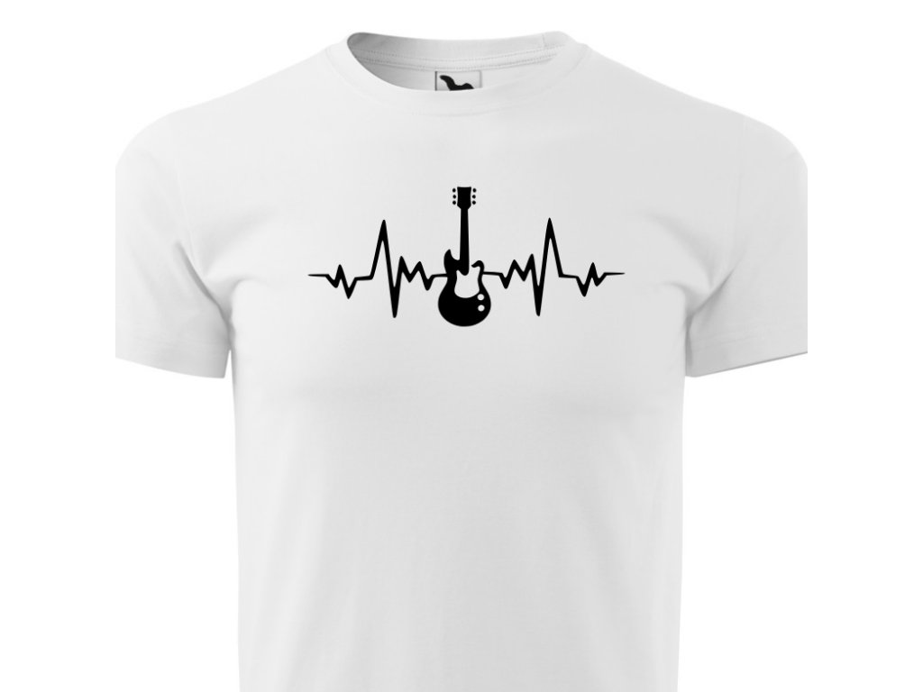Pánské hudební tričko Tep kytara v bílé barvě. Darujte tričko svým blízkým nebo sobě. Triko s potiskem je originální a vtipný dárek.