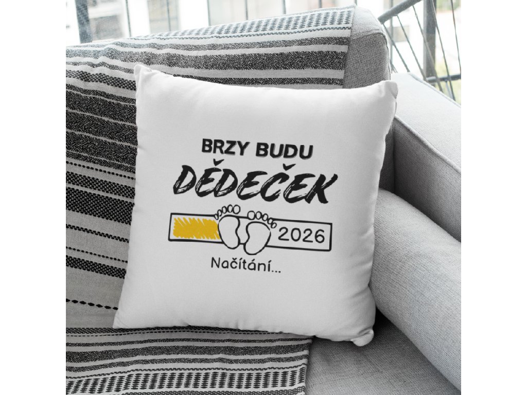 Rodinný polštářek Brzy budu dědeček. Potěšte budoucího dědu dárkem k narozeninám, Vánocům nebo jen tak. Polštářek s potiskem je originální a vtipný dárek.