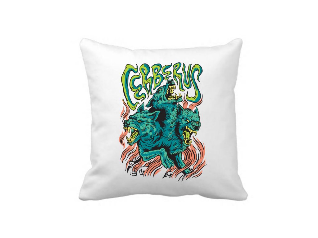 Originální polštářek s motivem řecké mytologie Cerberus. Polštářek s potiskem je vhodný jako dárek k narozeninám nebo k Vánocům.